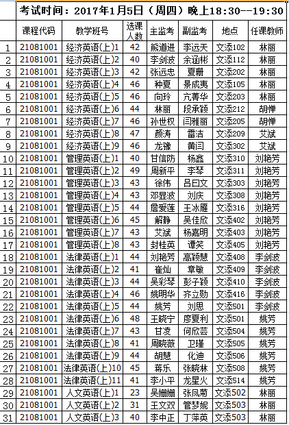 根据学校教学安排,本学期第18周将进行2016—2017年秋季学术型硕士研究生公共英语考试,考试时间为2017年1月5日(周四)晚18:30--19:30,地点在文添楼。具体考场安排见附件。