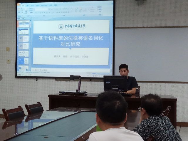 活动开始,雷威同学首先对其题为《基于语料库的法律英语名词化对比研究》的论文构思进行了展示。雷威同学从研究背景、研究问题、研究目的和意义、文献综述以及研究方法五个方面进行了呈现。其研究基于自建语料库研究方法,对中美法律文献文本中名词化现象的差异进行对比研究,语料分别选自CSC(中国学习者语料库)和ASC(美国学习者语料库)。展示完毕,李剑波教授和阮全友教授分别对雷威同学的研究给出了指导性的建议。阮教授指出,美国期刊的法律文献来源具有不可靠性,无法判断某些文献是否为美国本族人所作,这一问题有待进一步处理。李教授认为此项研究的目的和意义不够明确,同时,文献综述中的定义应找近三年的。